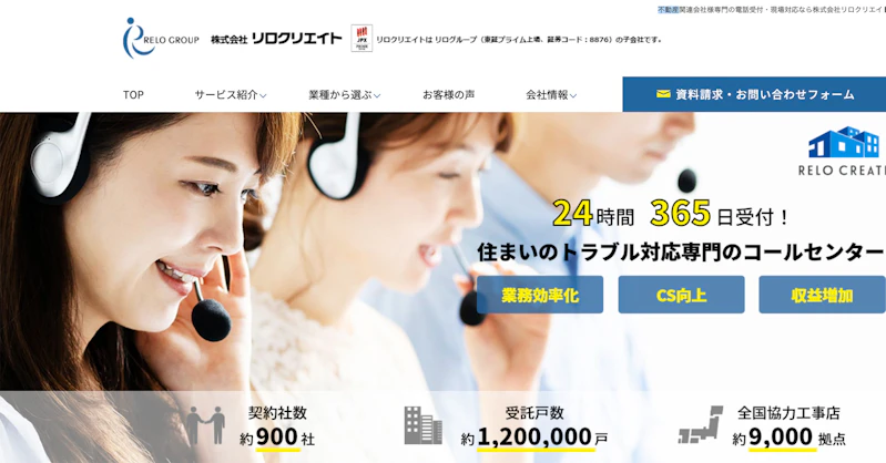 「株式会社リロクリエイト」のコールセンター代行サービスは、住まいのトラブルに特化した不動産管理会社向けのコールセンターです。24時間365日、物件の設備トラブルや居住者からのクレームに迅速に対応します。