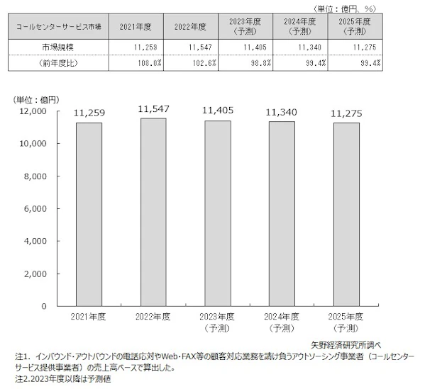 矢野経済研究所によると、コールセンター業界の市場規模は1兆1,547億円(2022年度)。2023年度以降の予測では1兆1,257億円と、やや減少する見通しとなっていますが、労働力不足によるアウトソーシングの需要は引き続き拡大すると見られています。