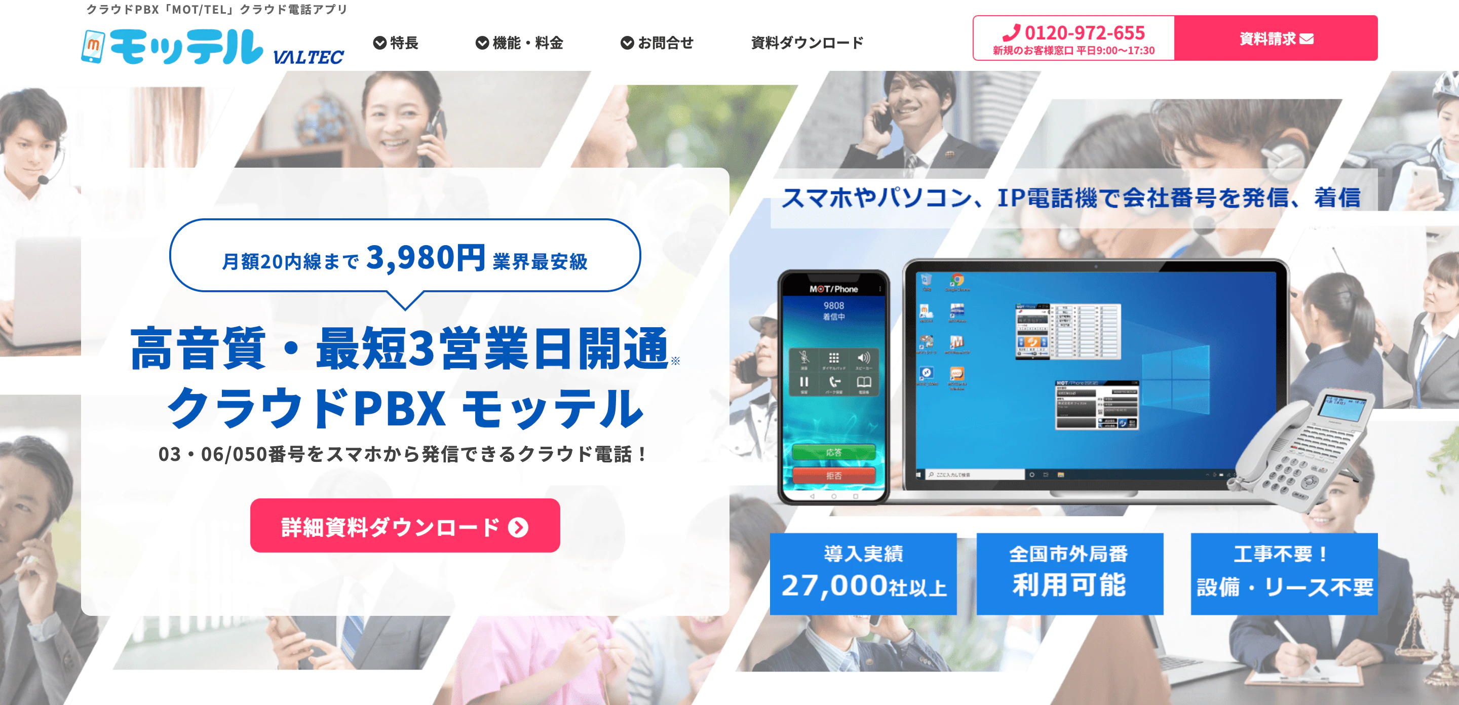MOT/TELはビジネスフォンをスマホ1台で実現できるクラウドPBXです。自動音声案内機能や顧客情報管理機能、FAX機能、災害対策など充実したシステム内容となっています。海外にいてもインターネット回線を通じてサービスを受けることが可能です。