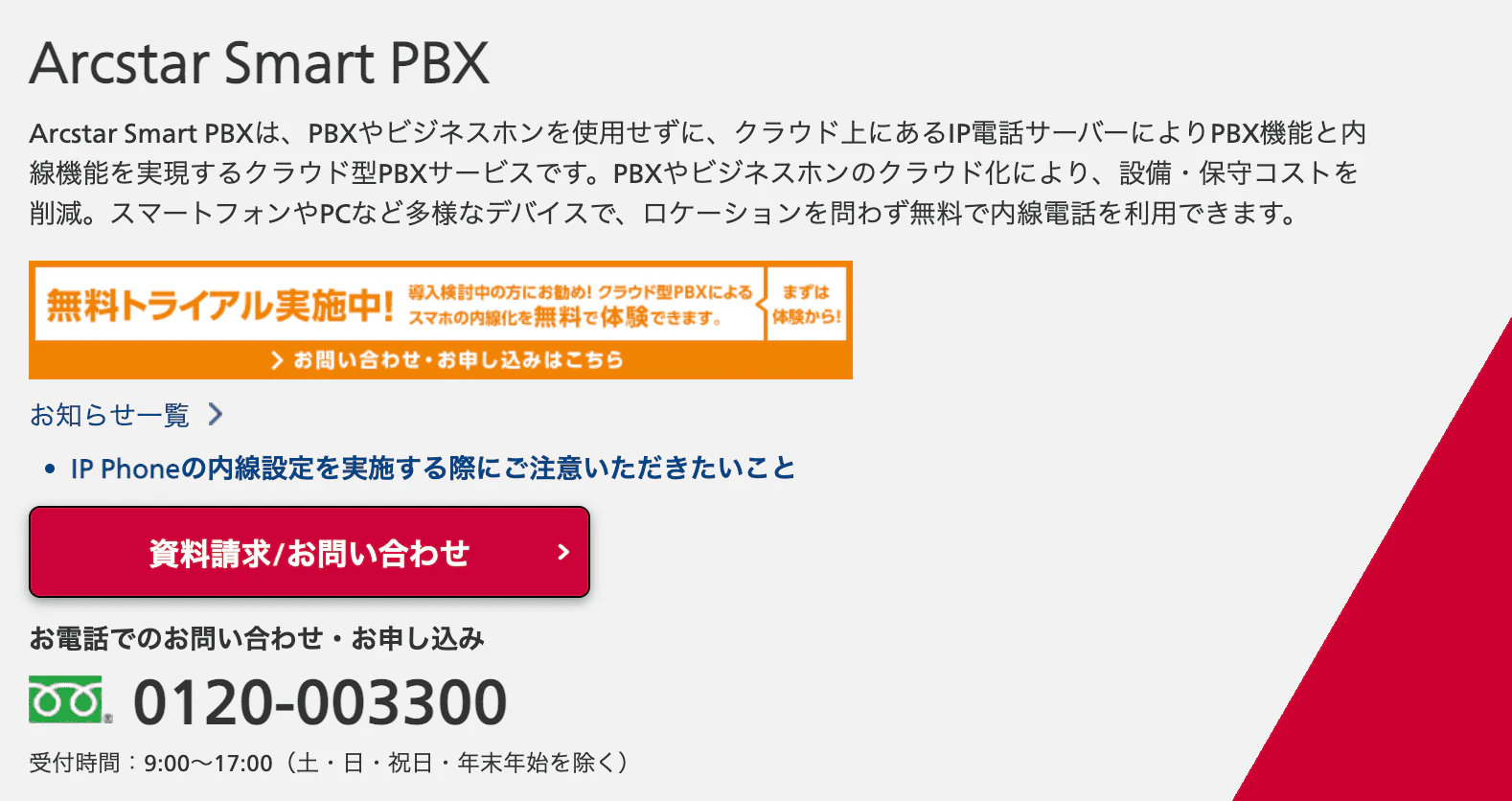 Arcstar Smart PBXは、NTTコミュニケーションが提供するクラウドPBXサービスで、同社による別サービスと組み合わせることができる点が強みです。全国展開している企業などにふさわしい、大規模な設備が整っています。