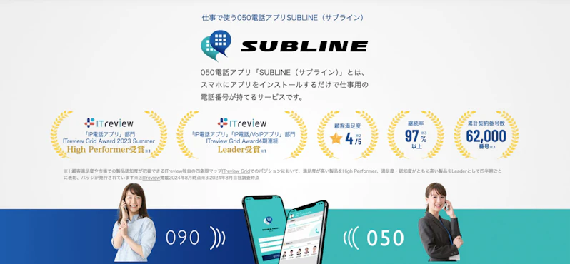 「SUBLINE(サブライン)」は、月額550円から利用できる比較的安価なIP電話アプリです。番号表示を最適化する独自技術により、高い接続率と通話品質を実現しています。