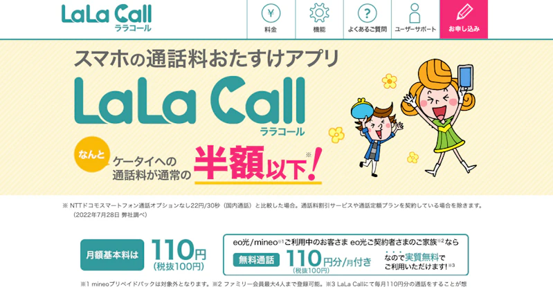 「LaLa Call(ララコール)」は、月額429円〜という低価格で利用できるIP電話アプリです。料金は抑えつつ、必要最低限の機能をそなえています。